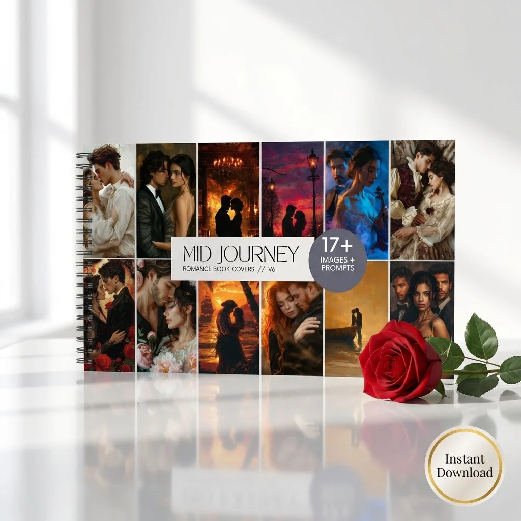 Create stunning, high-quality romance book cover art and promotional images with ease using our Midjourney AI prompts! This guide provides expertly crafted prompts and visual examples to help you design custom book covers, social media content, and branding materials—without the high cost of stock photos.
