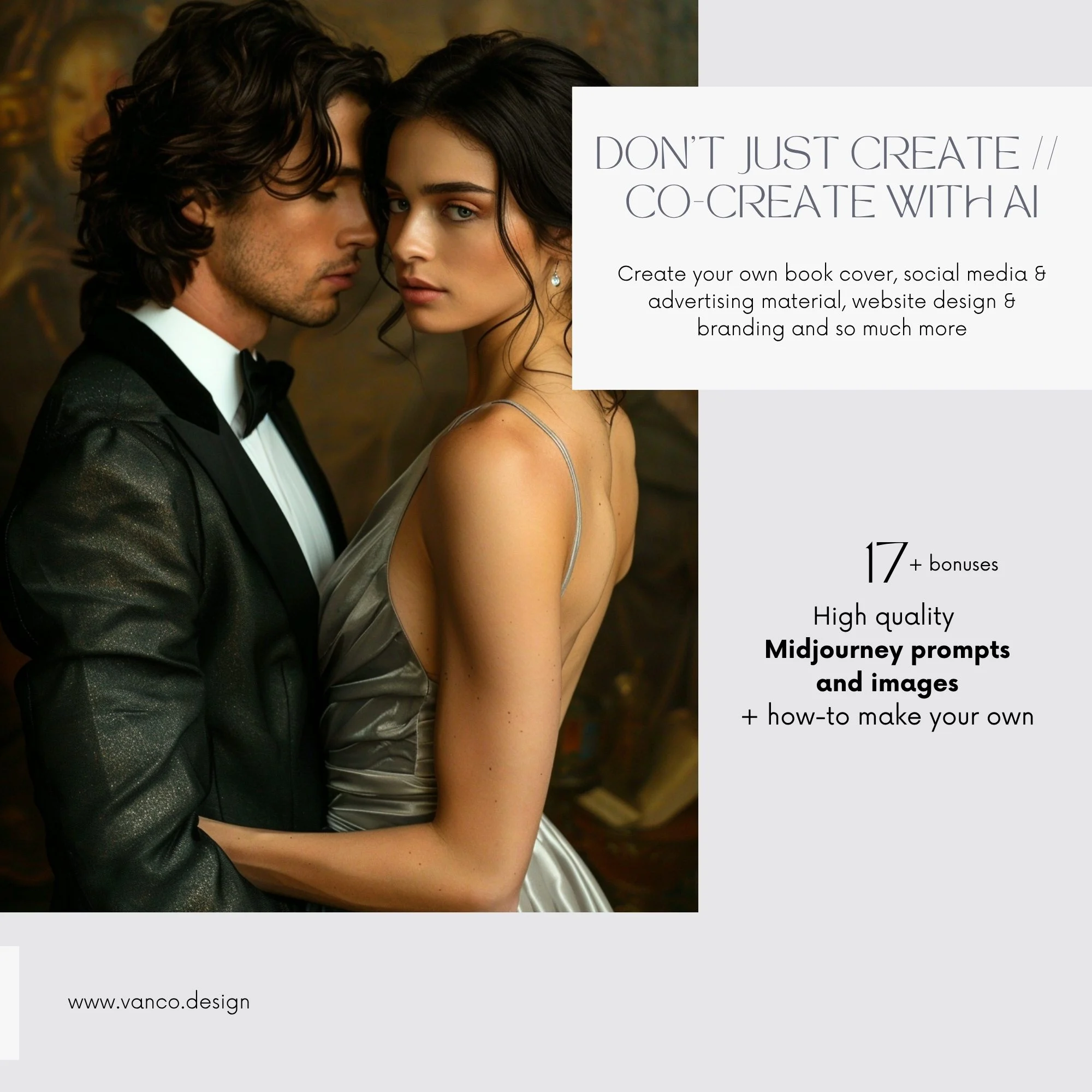 Don’t just create great stories, co-create with our Midjourney prompts to craft your own high quality book & eBook covers for your latest novel and promotional stock images for social media, creative projects, website design, branding and so much more to promote your works.