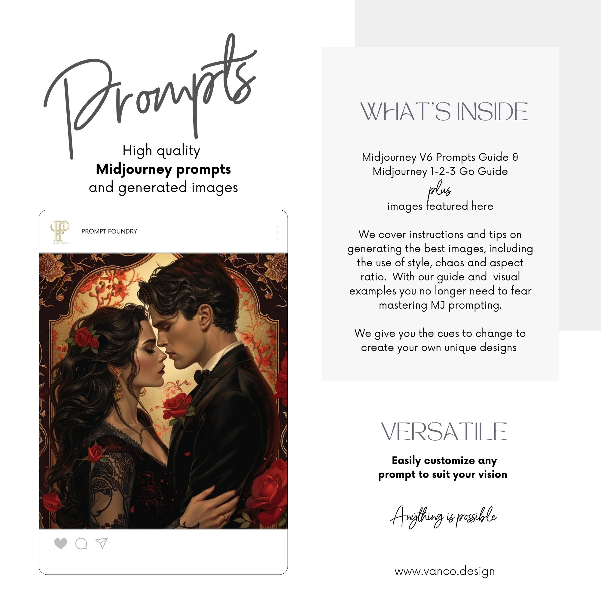 Easily customise any Midjourney prompt to suit your vision. We give you the keyword cues to any look and feel! – Anything is possible